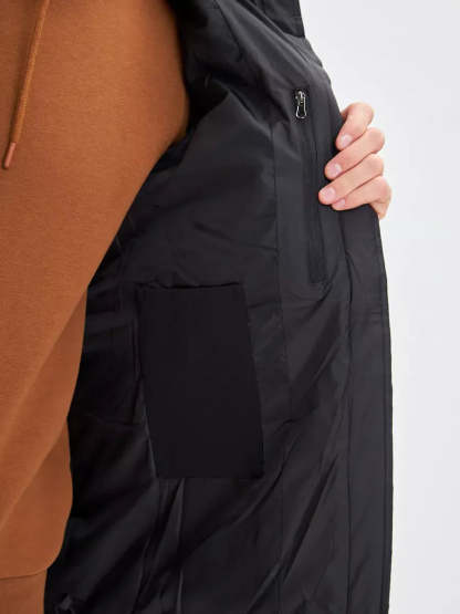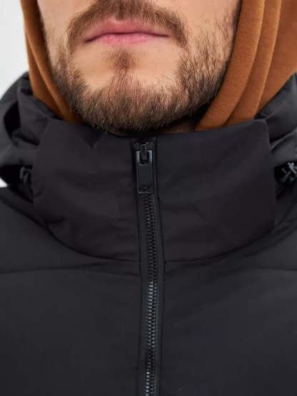 - Hoge kraag en capuchon voor extra warmte.