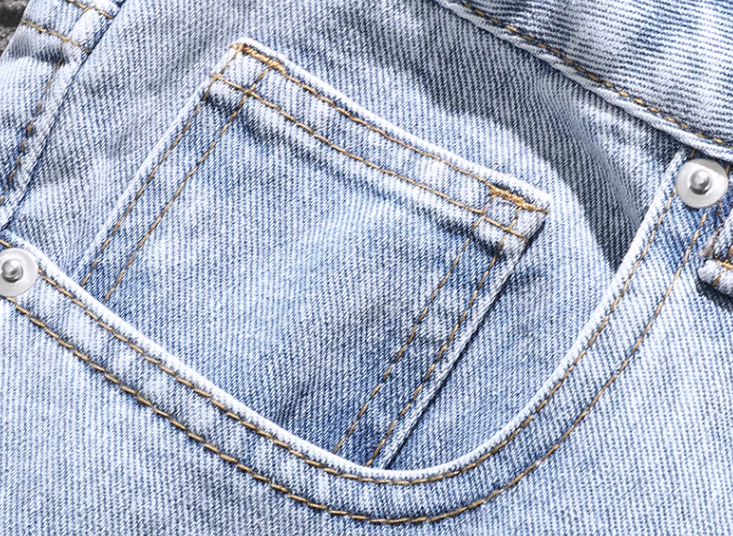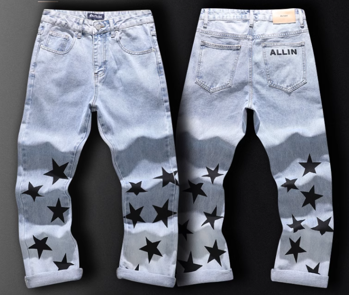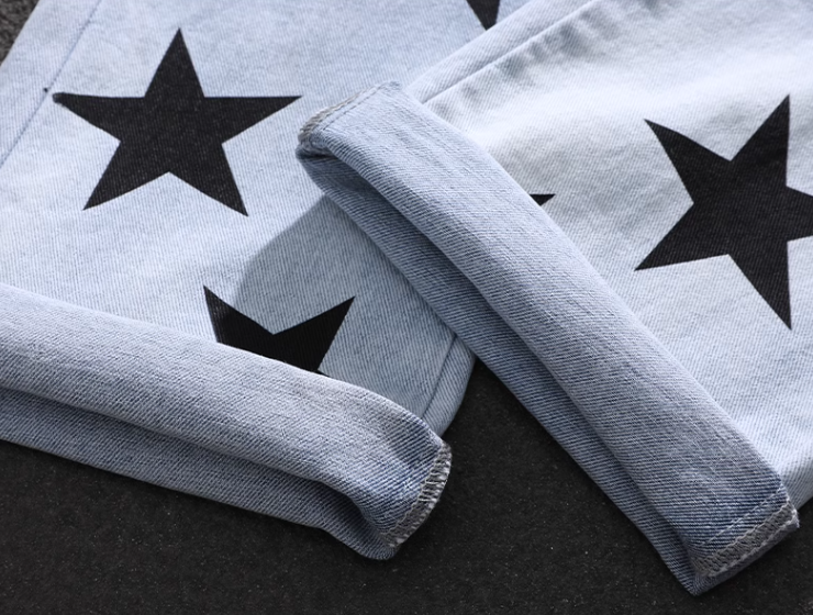 American distressed jeans for men 2023 spring and summer trendy star printed loose straight trousers blue versatile