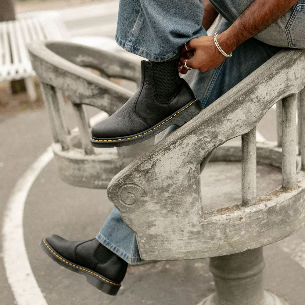 Ci siamo ammorbiditi. Abbiamo rivoluzionato il nostro classico stivaletto Chelsea 2976 utilizzando la lussuosa pelle Ambassador: un materiale martellato, morbido al tatto e dall'aspetto lucido che ti farà sentire come se avessimo modellato la scarpa per il tuo piede. Così sarà ancora più facile indossare un modello Dr. Martens Original. La suola presenta le classiche rifiniture gialle DM's e il nostro caratteristico motivo scanalato. Sul tallone, troverai l'inconfondibile linguetta gialla e nera AirWair.