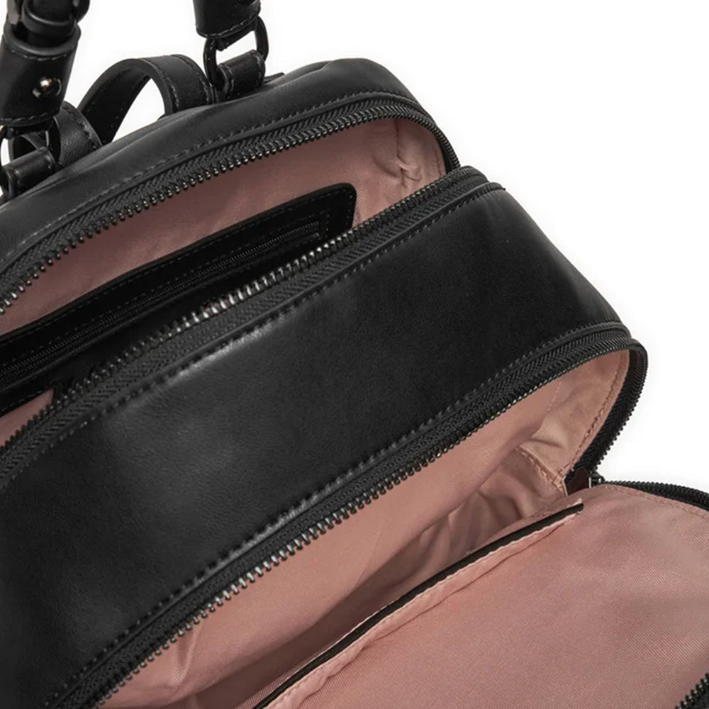 Zaino in tessuto jacquard con logo all over con inserti in ecopelle, diviso in due scomparti chiusi con zip. Logo in rilievo sul davanti. Spallacci regolabili.